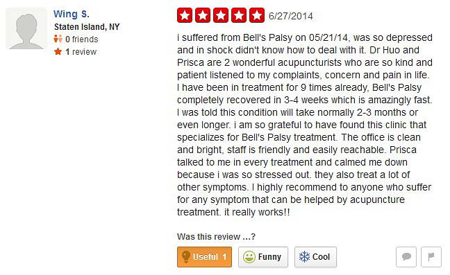 When the symptoms of bells palsy presented! I knew I had to go for acupuncture. I searched on the Internet and found HM acupuncture and reviewed their website and read how they catered to patients with my specific medical condition.